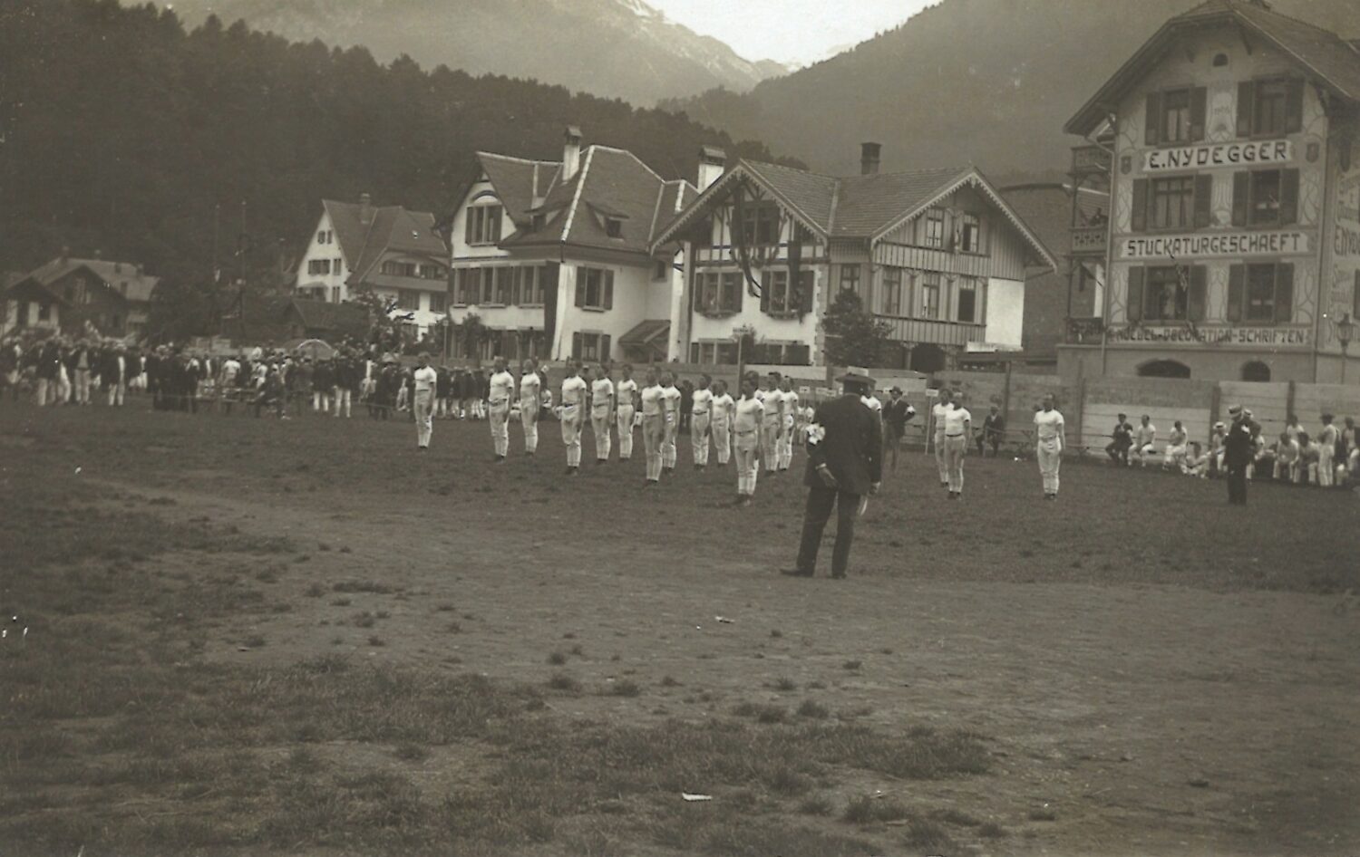 Auf dieser postalisch nicht gelaufenen Fotokarte aus der Sammlung von Mario Klaus sehen wir auf einem Platz einen in Reih und Glied aufgestellten Turnverein. Aufgrund der Beflaggung eines Gebäudes dürfte es sich um ein regionales Turnfest handeln. Am Rande des Festgeländes steht eine Häuserreihe. Eines dieser Häuser ist mit der Aufschrift “E. Nydegger, Stuckaturgeschaeft, Moebel, Decoration, Schriften“ versehen. Dies könnte einen wertvollen Hinweis für die Identifikation liefern. Das Dorf, in dem dieses Turnfest stattfand, liegt am Rande zweier bewaldeter Hügel und im Hintergrund steigt das Gelände zu einem höheren Berg an. Wo und wann hat dieses Turnfest stattgefunden? Wer kann diesen Ort identifizieren?